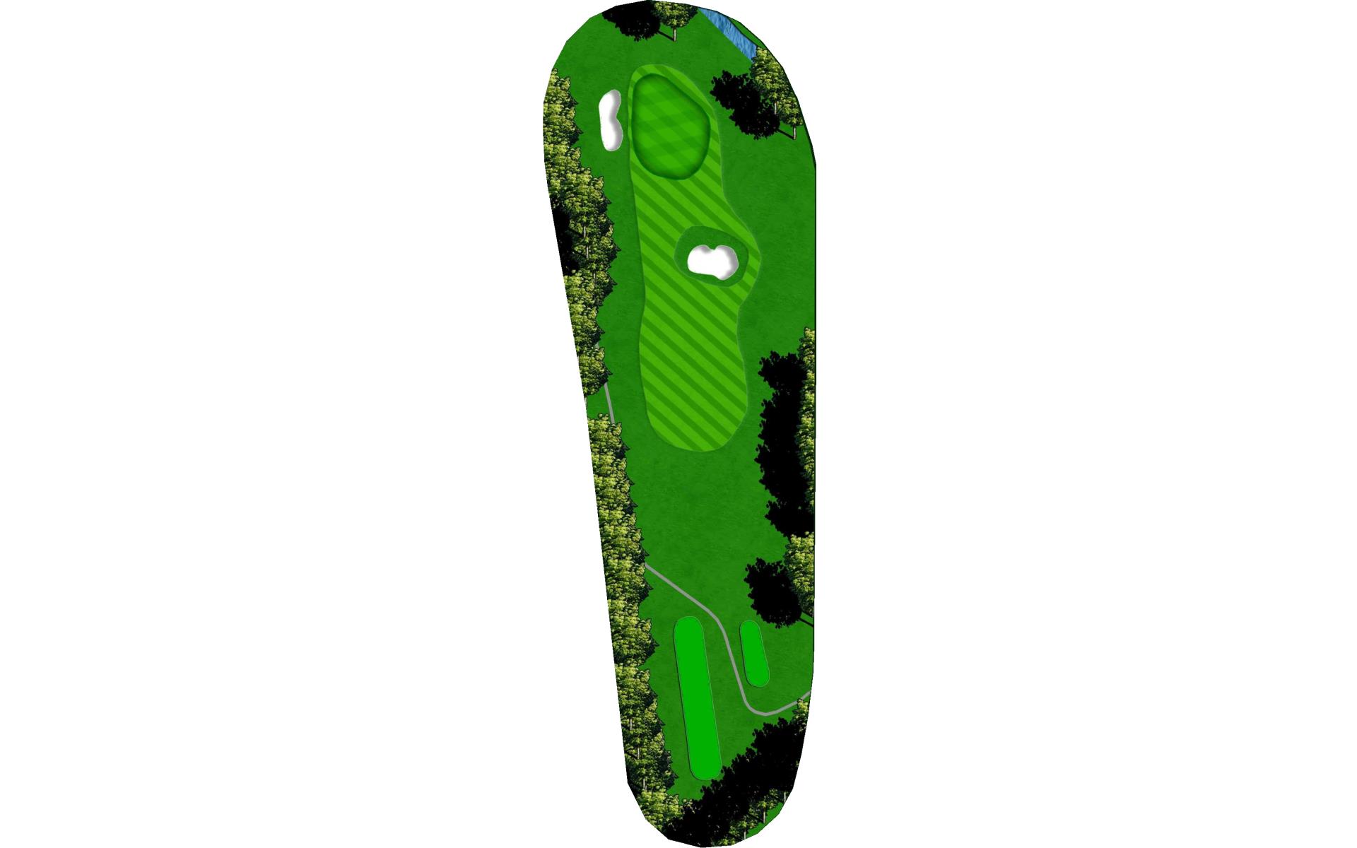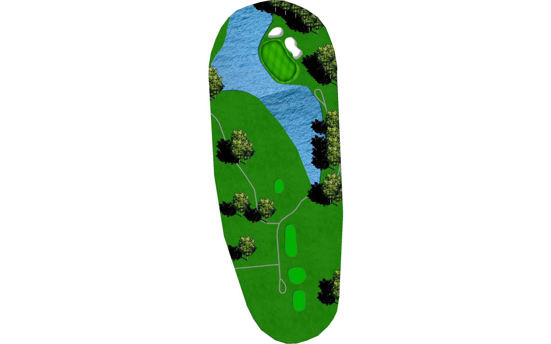 It's a big green, but protected by OB and water. Just aim at the middle of the green and two put for par and you will gain on the field.