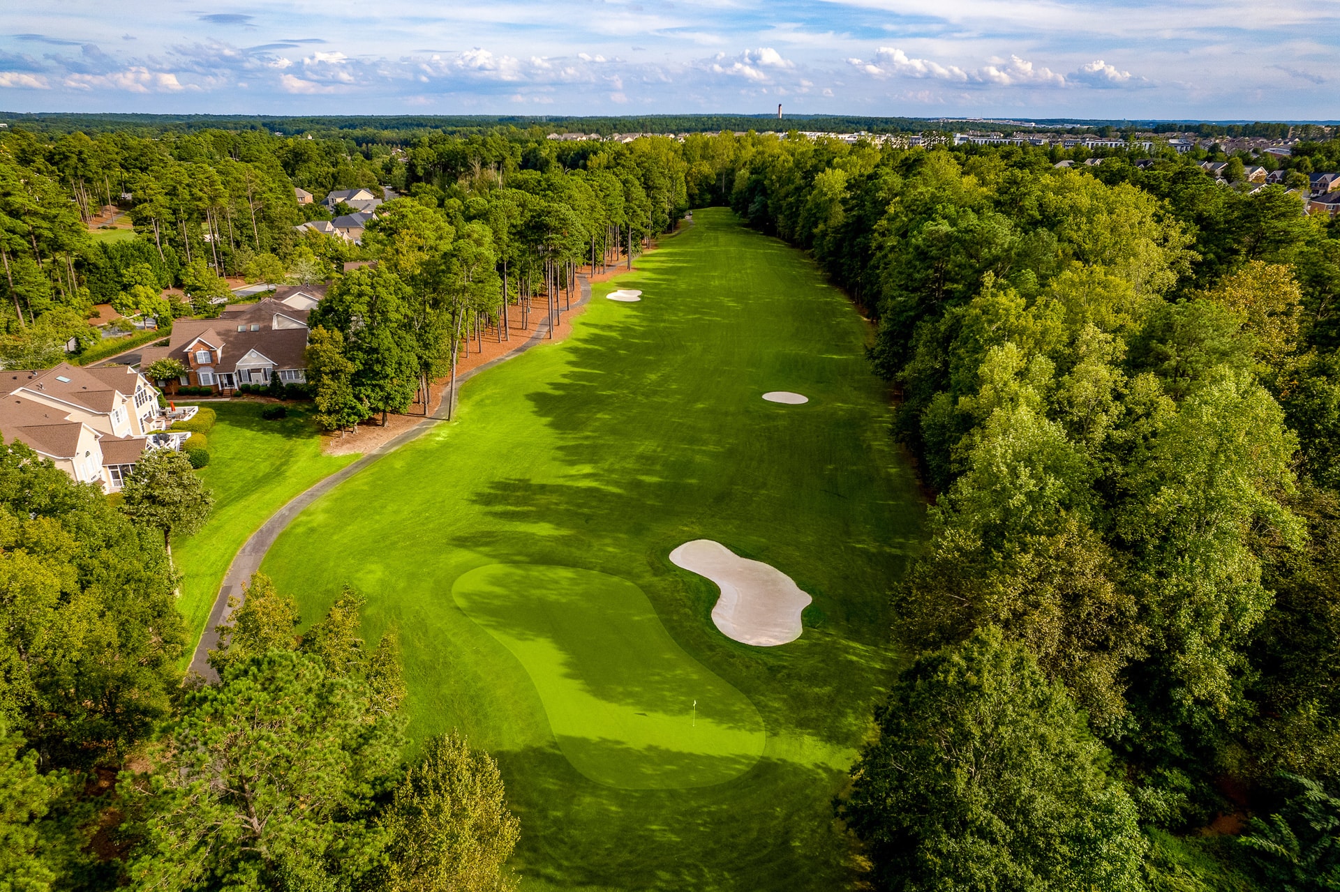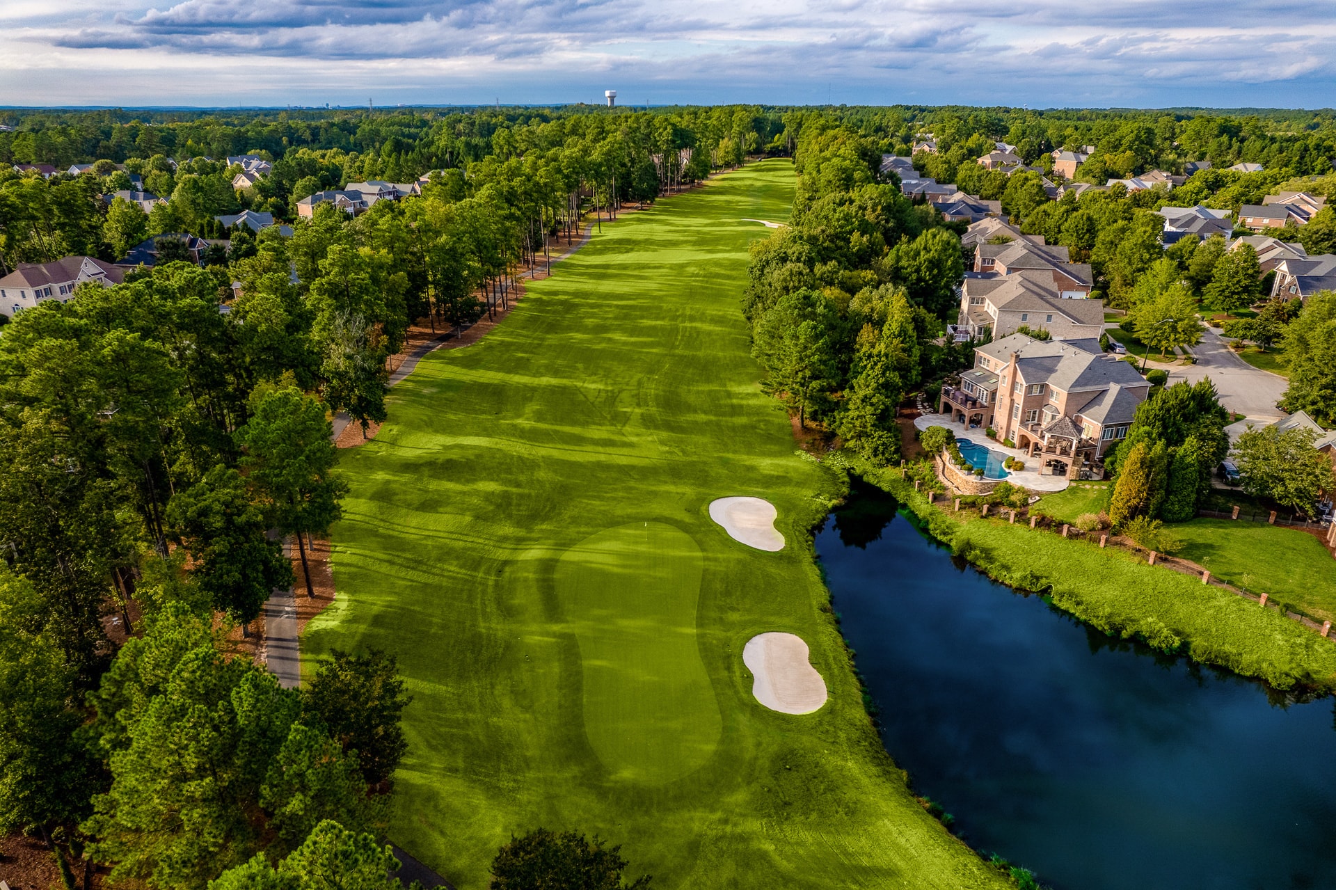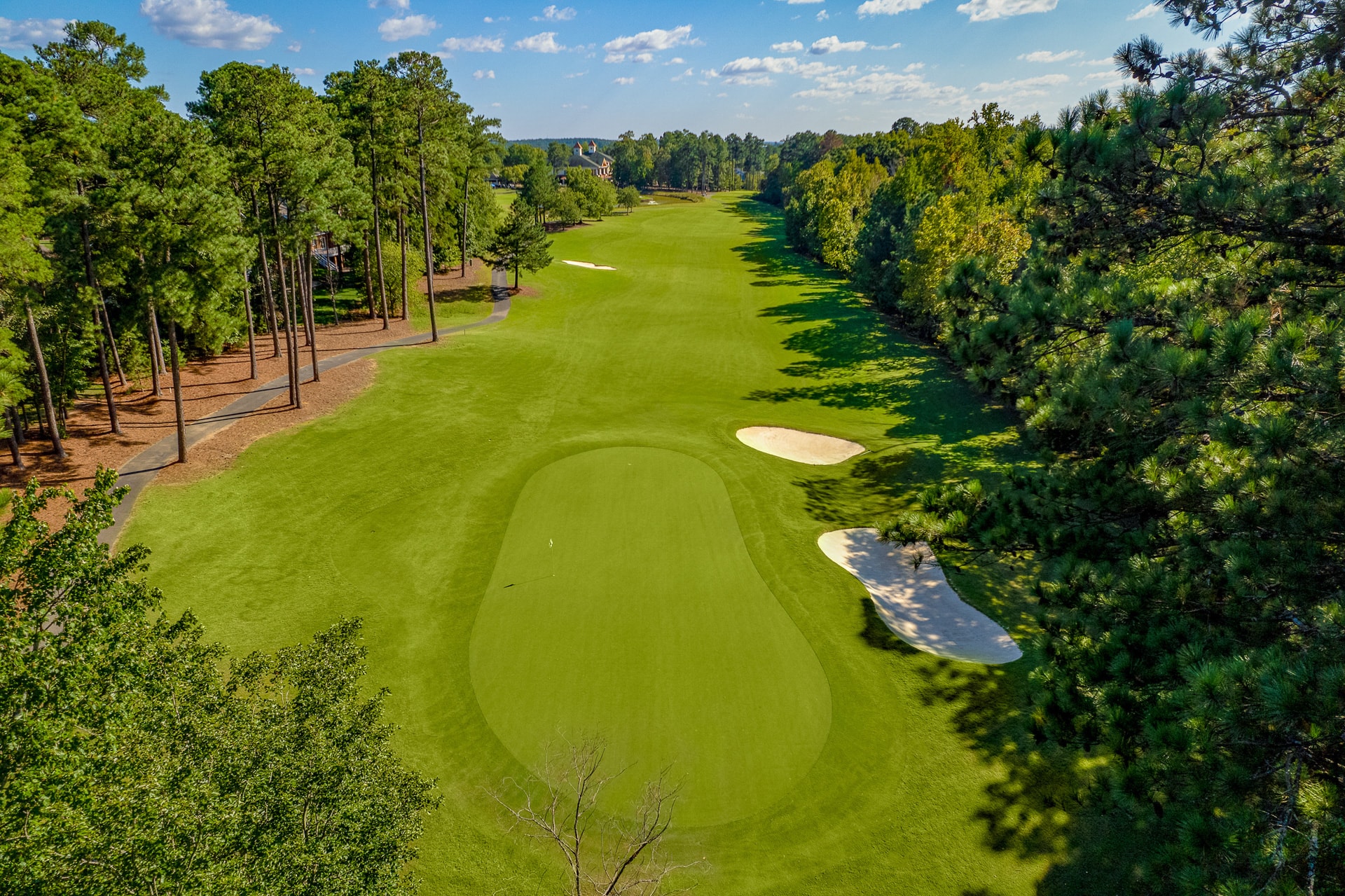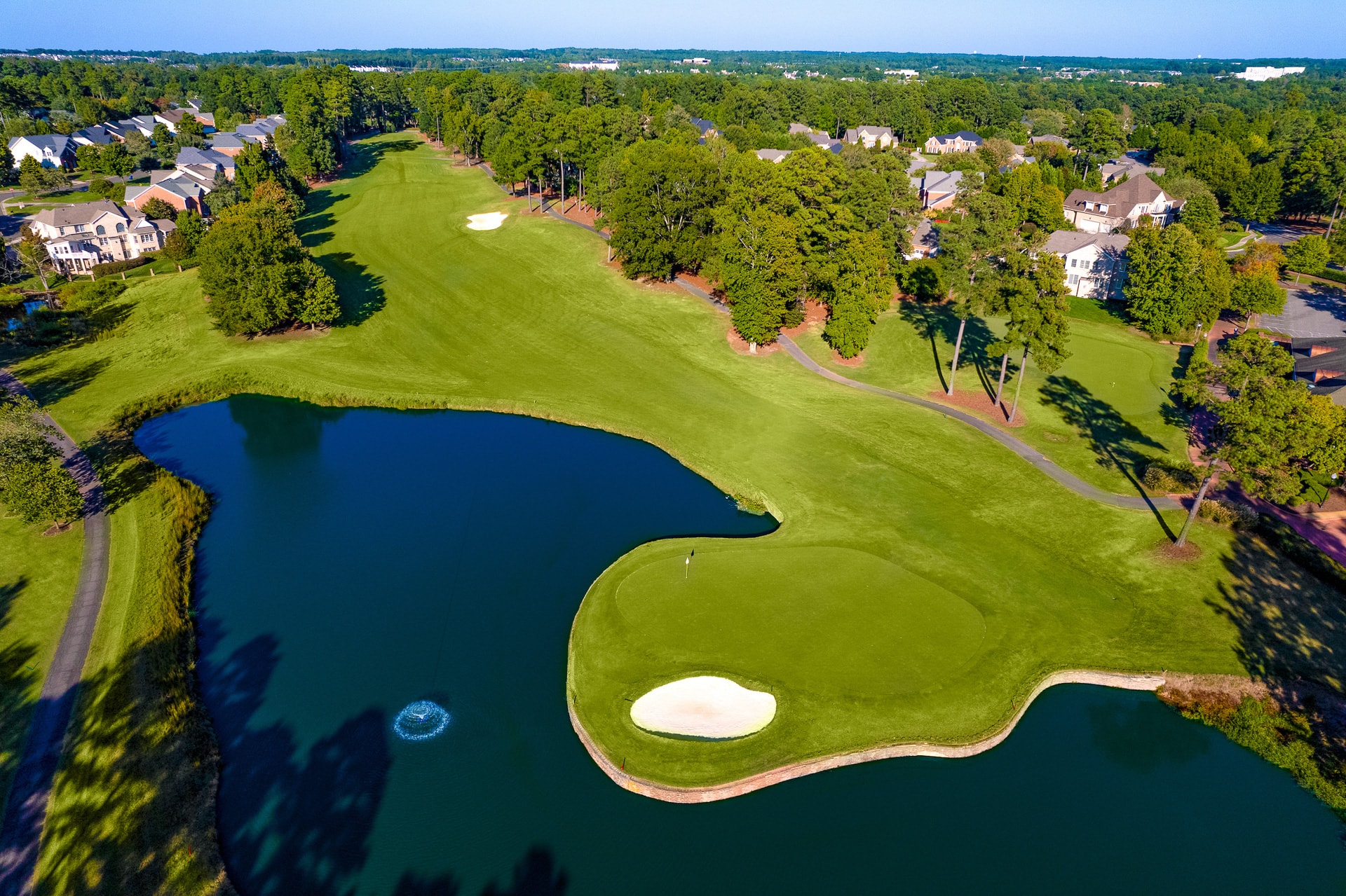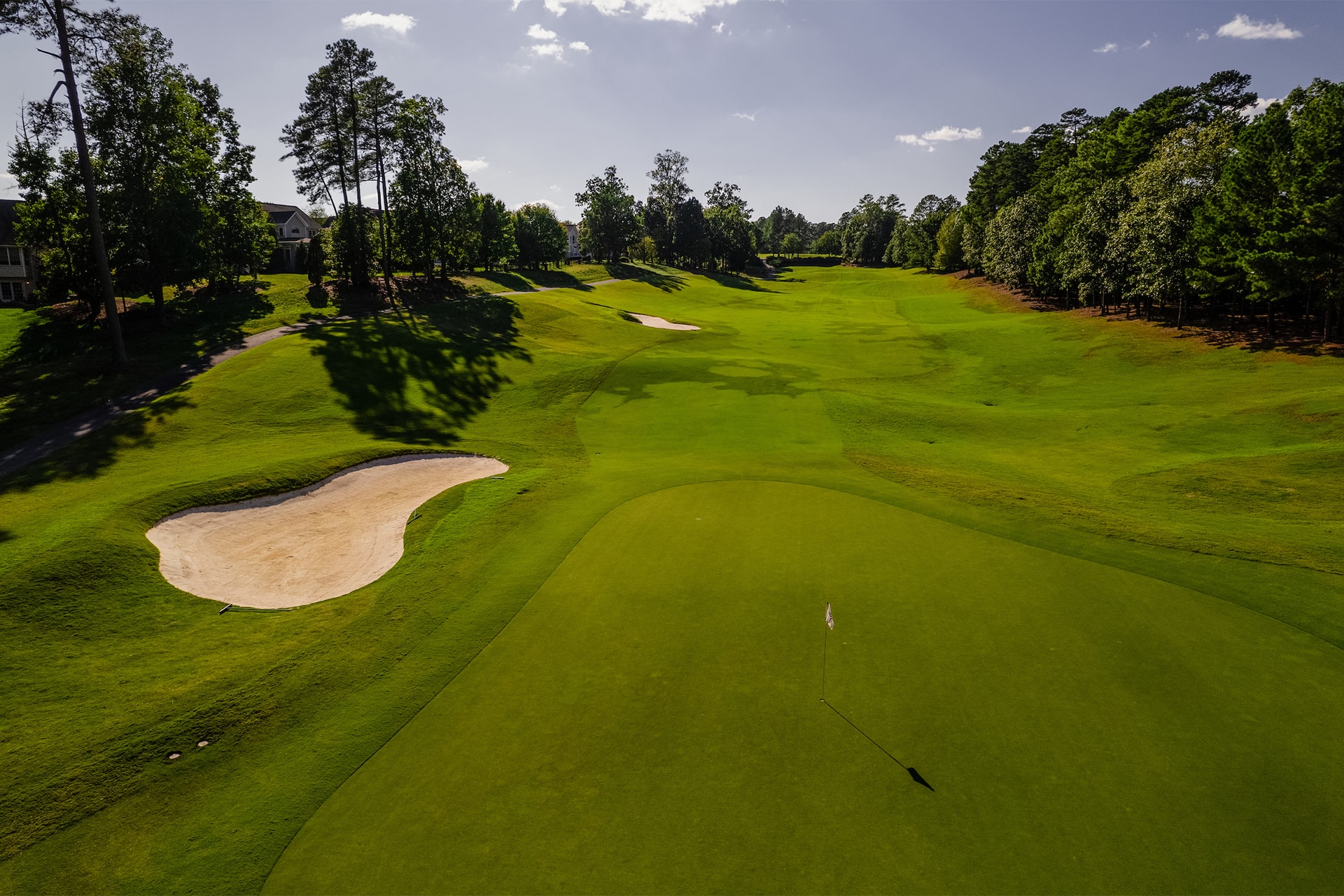 This signature par four is a perfect way to end your round. A well-placed drive will tempt players to test their skills in negotiating this intimidating green setting. Surrounded by water on three sides and bordered by the Carolina ledgestone retaining wall, players may elect to play safe to the left.