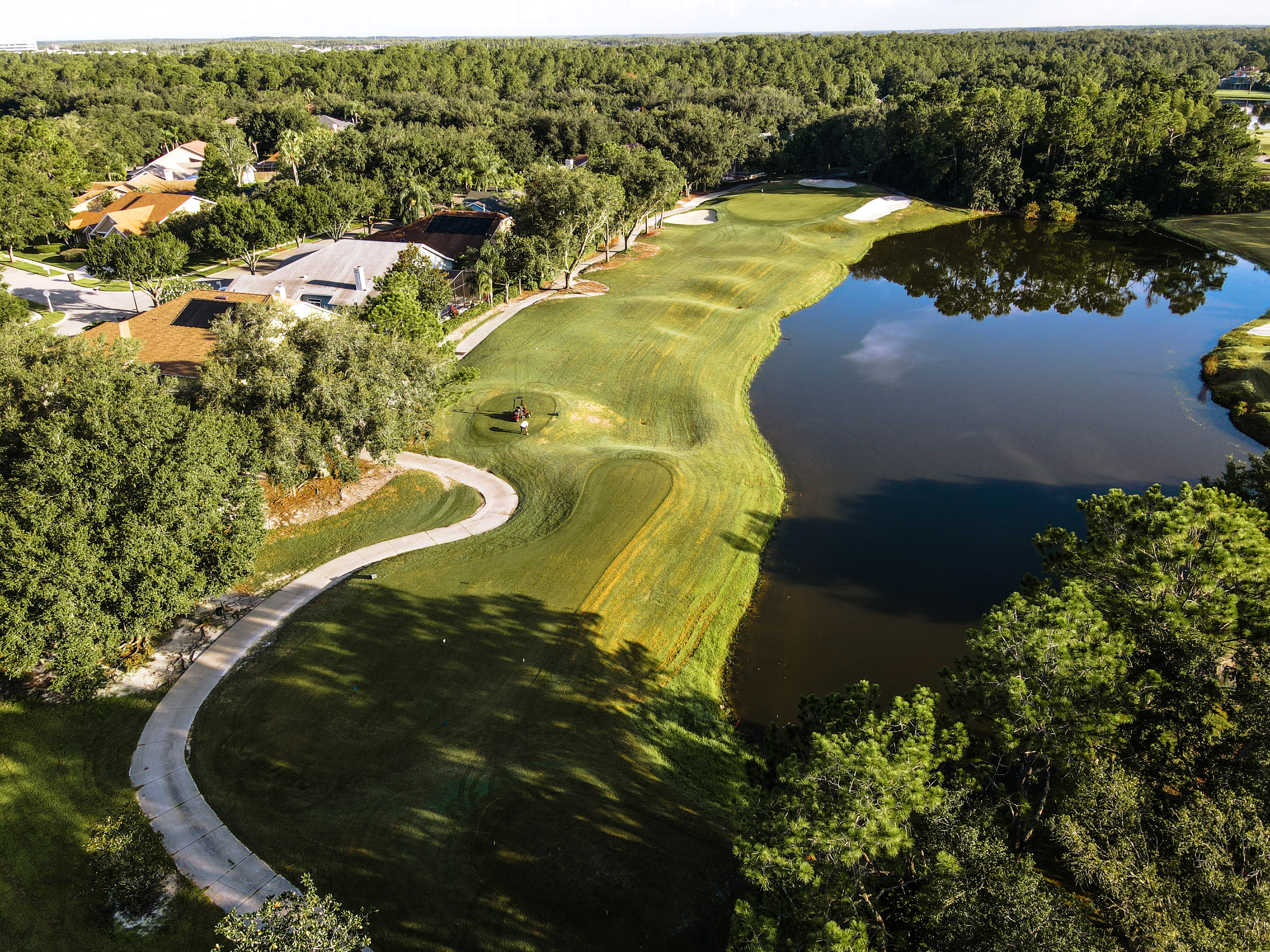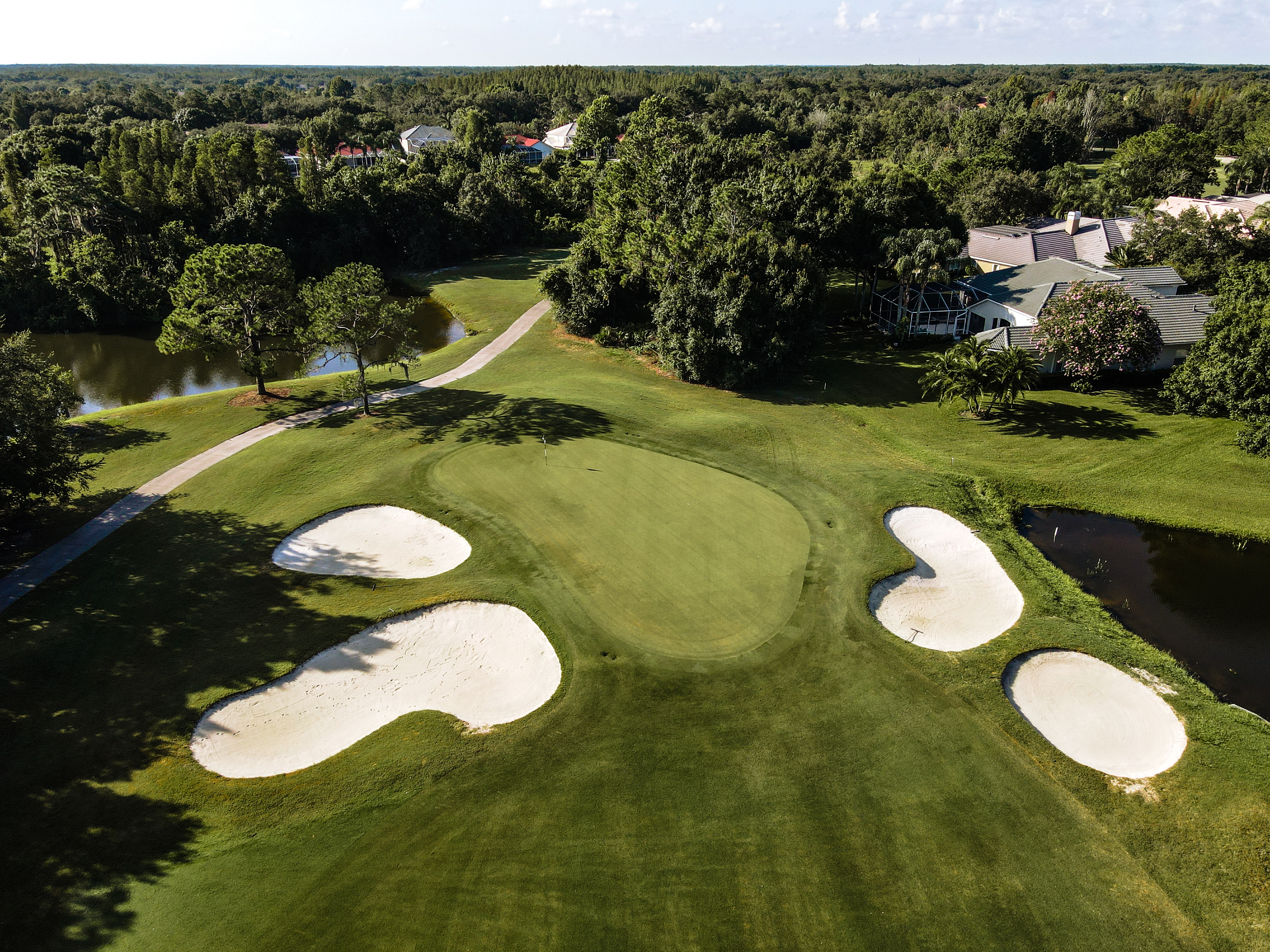 A challenging par 3 with water on both sides requiring a solid long iron or hybrid shot into a kidney-shaped green sloping back to front. Make sure to cover the large front bunker or you will have a challenging up and down.