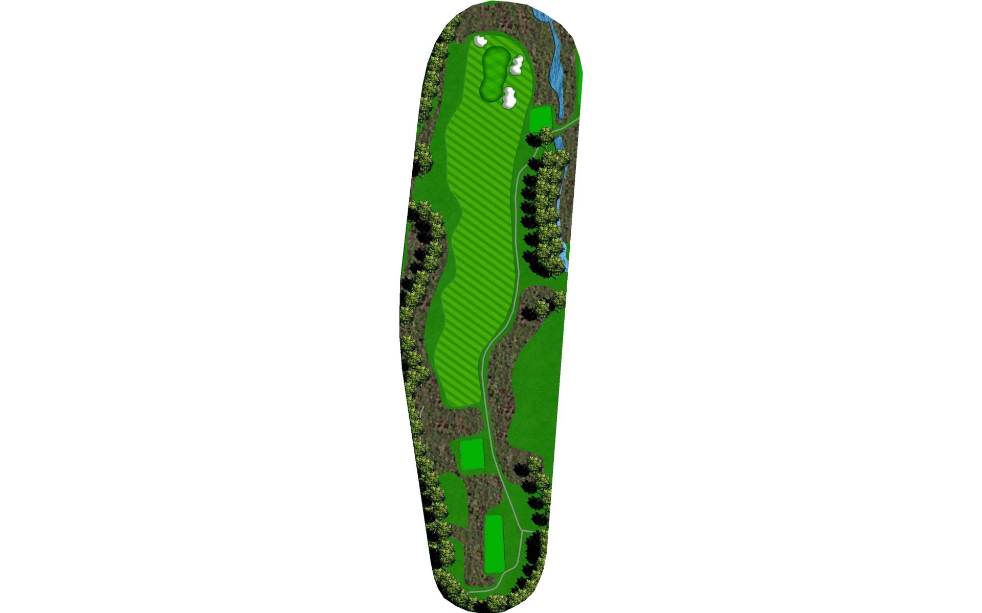 Tee shot through a narrow shoot. Golf balls hit on the left side of the fairway typically will bounce right. The green is narrow and protected by water on the front and a bunker all along the back side.