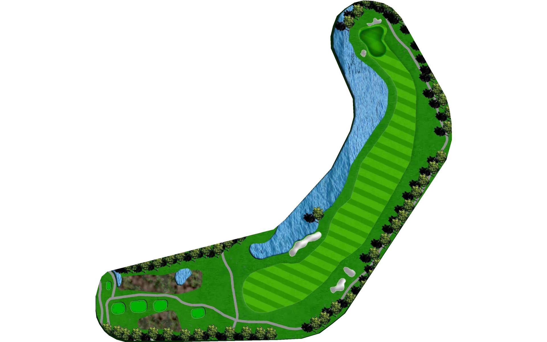 Huge dogleg left with a lake that runs up the entirety of the left side.