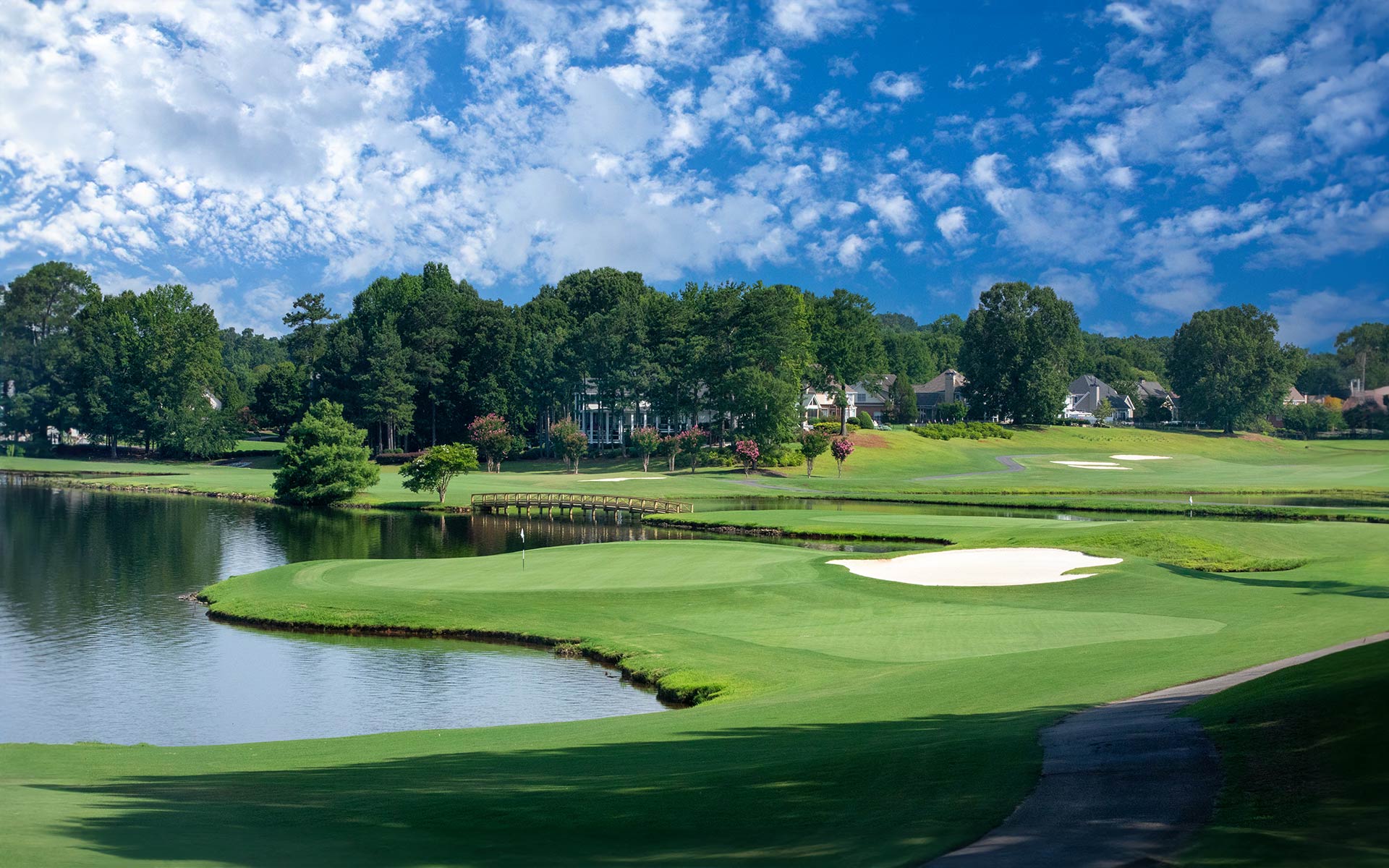 The shortest of the par 5's. Water along the right side and bunkers and OB guarding the left. A well guarded green, with bunkers left, while…