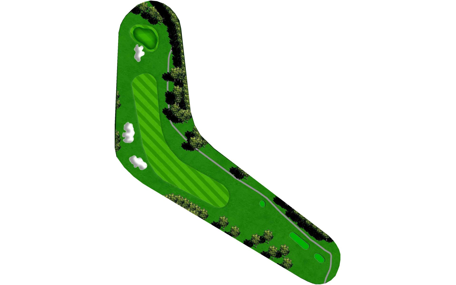 Downhill dogleg left. The fairway makes a 90-degree turn left at about 90 yards out from the green with water. The green slopes strongly from back to front with a dangerous pond on the very front edge of the green.