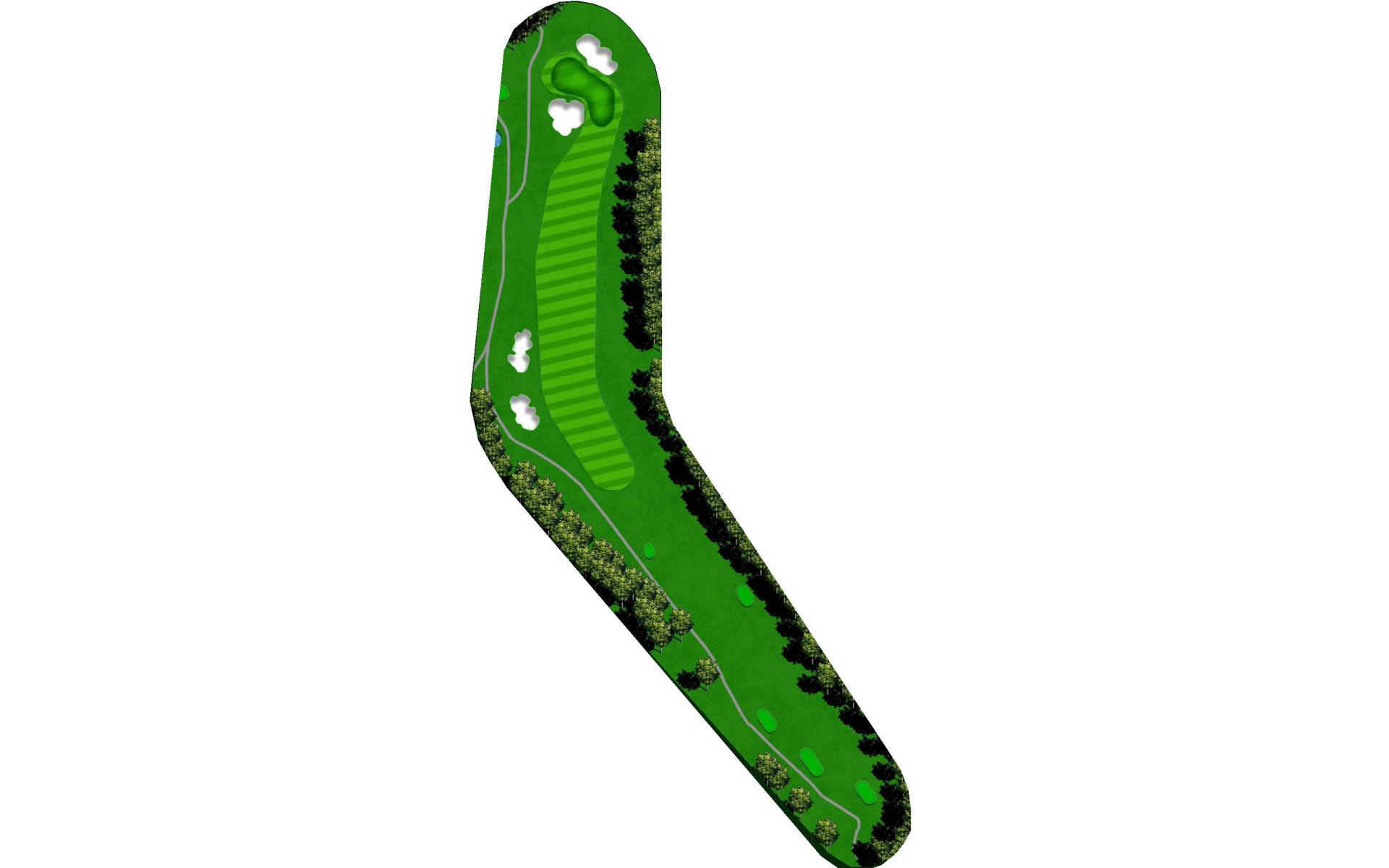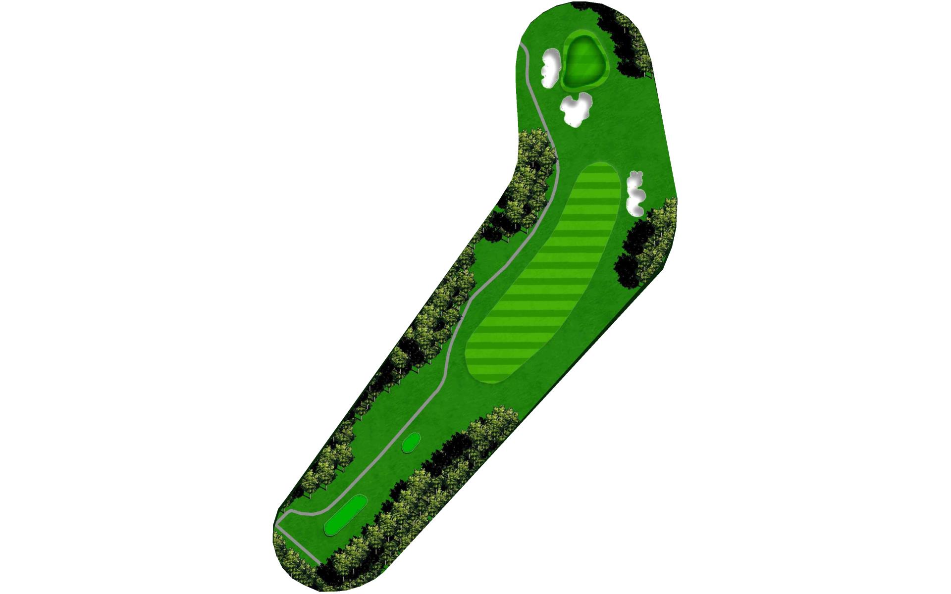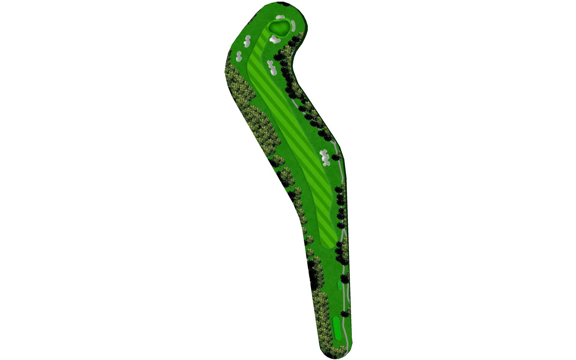 Dogleg right Par 4 with out-of-bounds left and a wooded penalty area on the right. The green complex has three distinct tiers which slope from back to front.