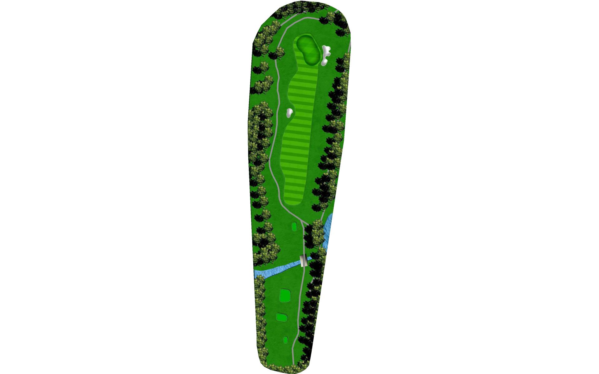 A short but difficult par 3, well bunkered with water to the left side of the green. A severely sloping green will require an accurate shot to stay below the hole. Proper club selection is key here, as overhit shots will be severely penalized over the green.