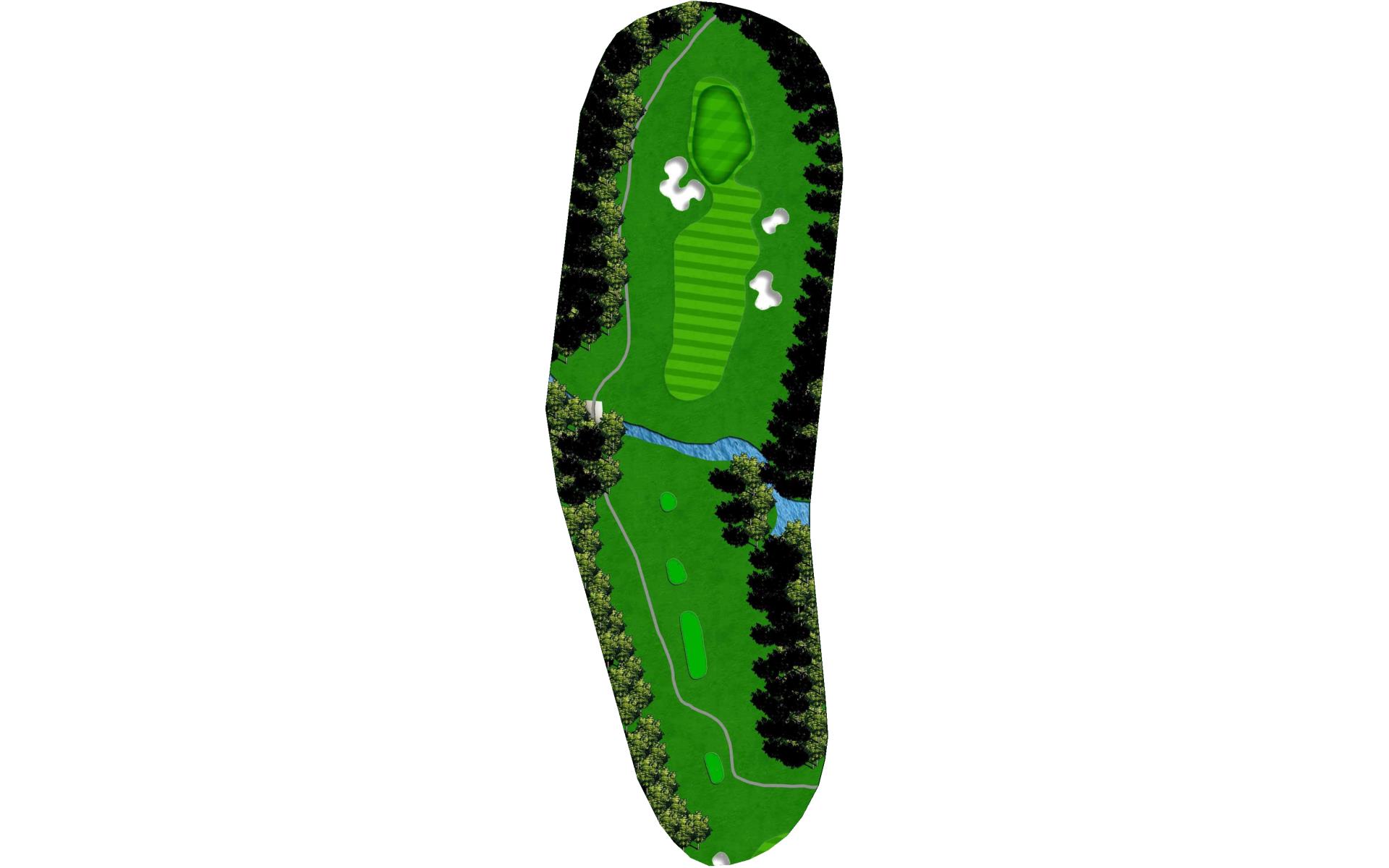 A scenic downhill dog leg right par 4 with a forced carry on your tee shot over a large creek. A very difficult second shot up hill to another well bunkered, spacious green.