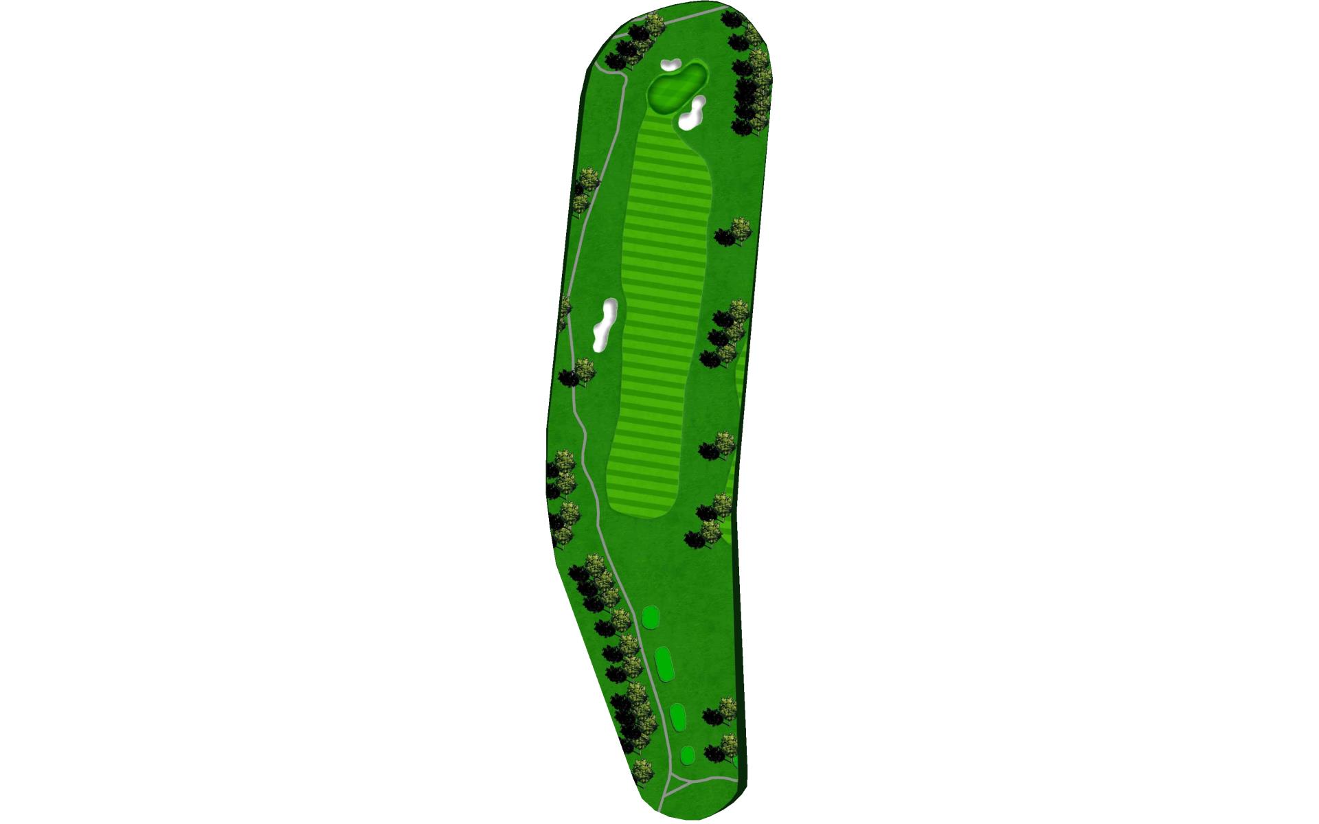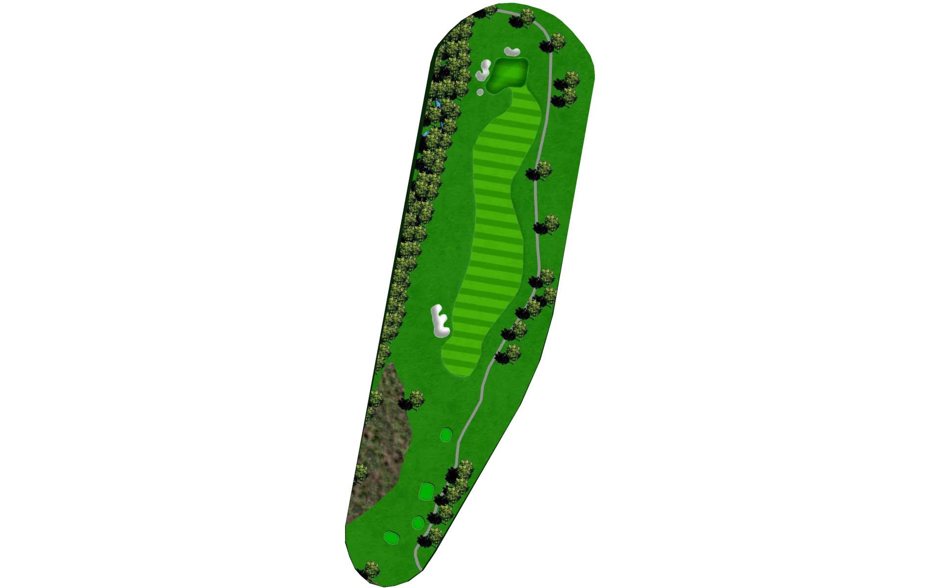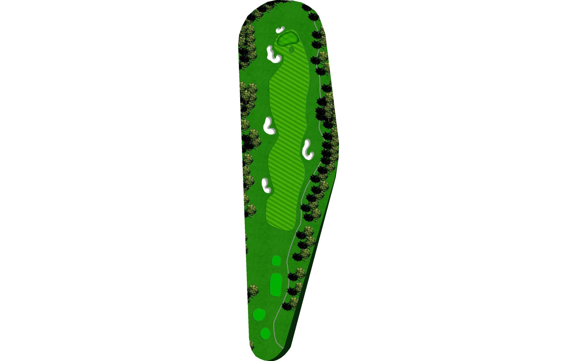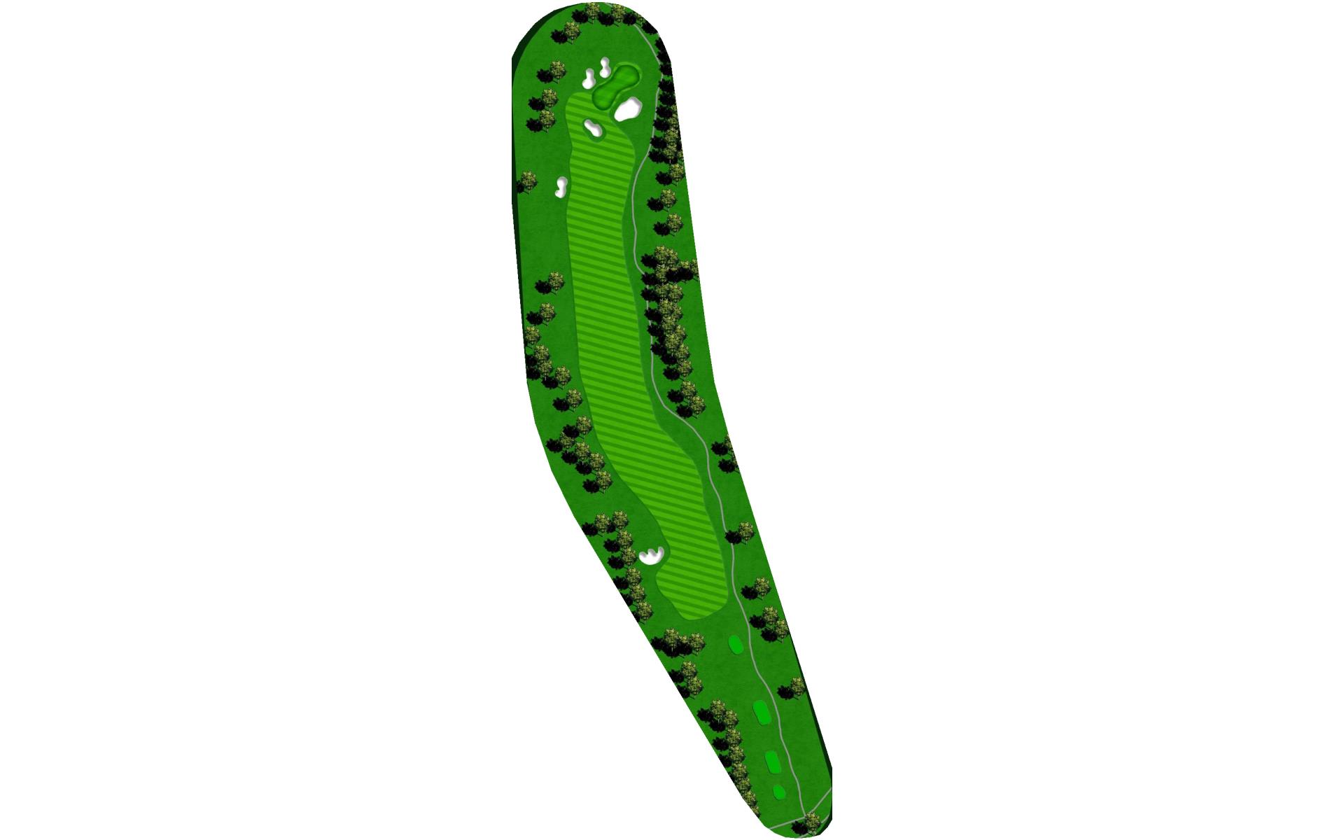 A long mid to long iron will have to be accurate to this heavily guarded green complex. Although the green is guarded in front, the shot that goes over is an almost automatic bogie. The green is narrow from the right side to the middle of the green and then expands from front to back on the left side of the green. If the pin is in a favorable spot this hole can be attacked.