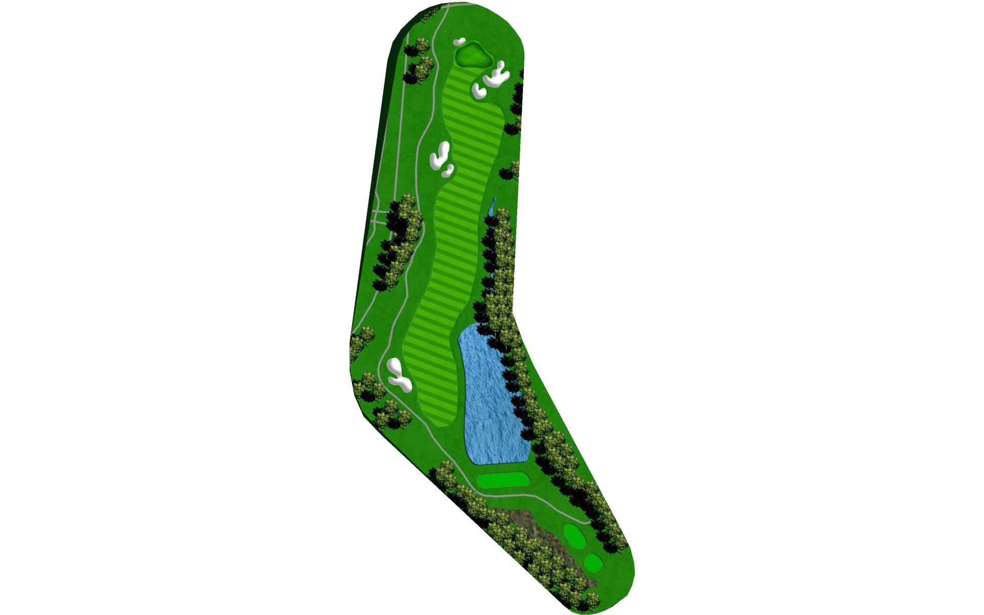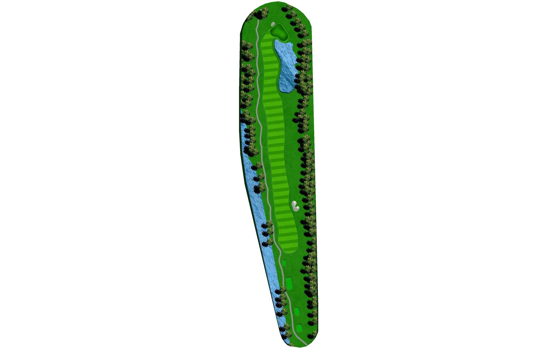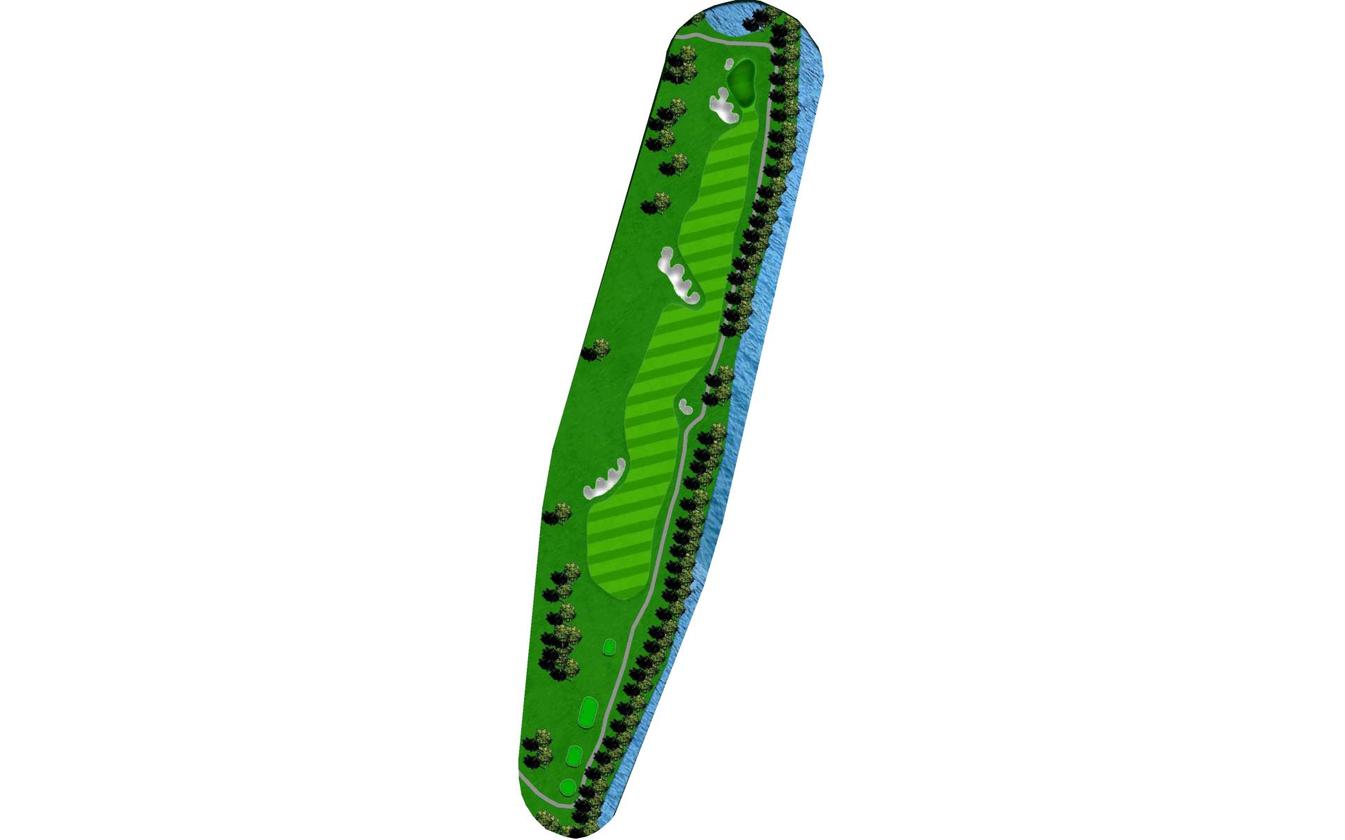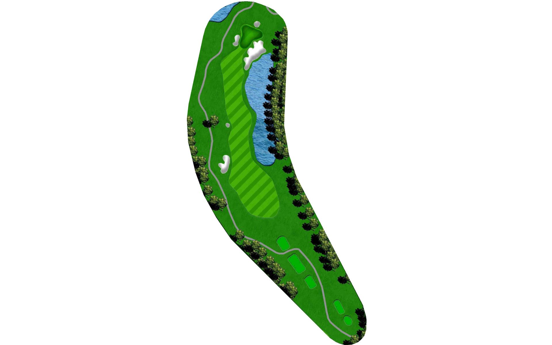 This par five will be a three-shot par five for most. A well-placed drive should stay on the left side of the fairway. This will give a better vantage point for the second shot around the slight dogleg right. A great angle for your third shot will be from the far left of the fairway. The green is again narrow from front to back, oblong in shape and is protected by a front right and back middle bunker.