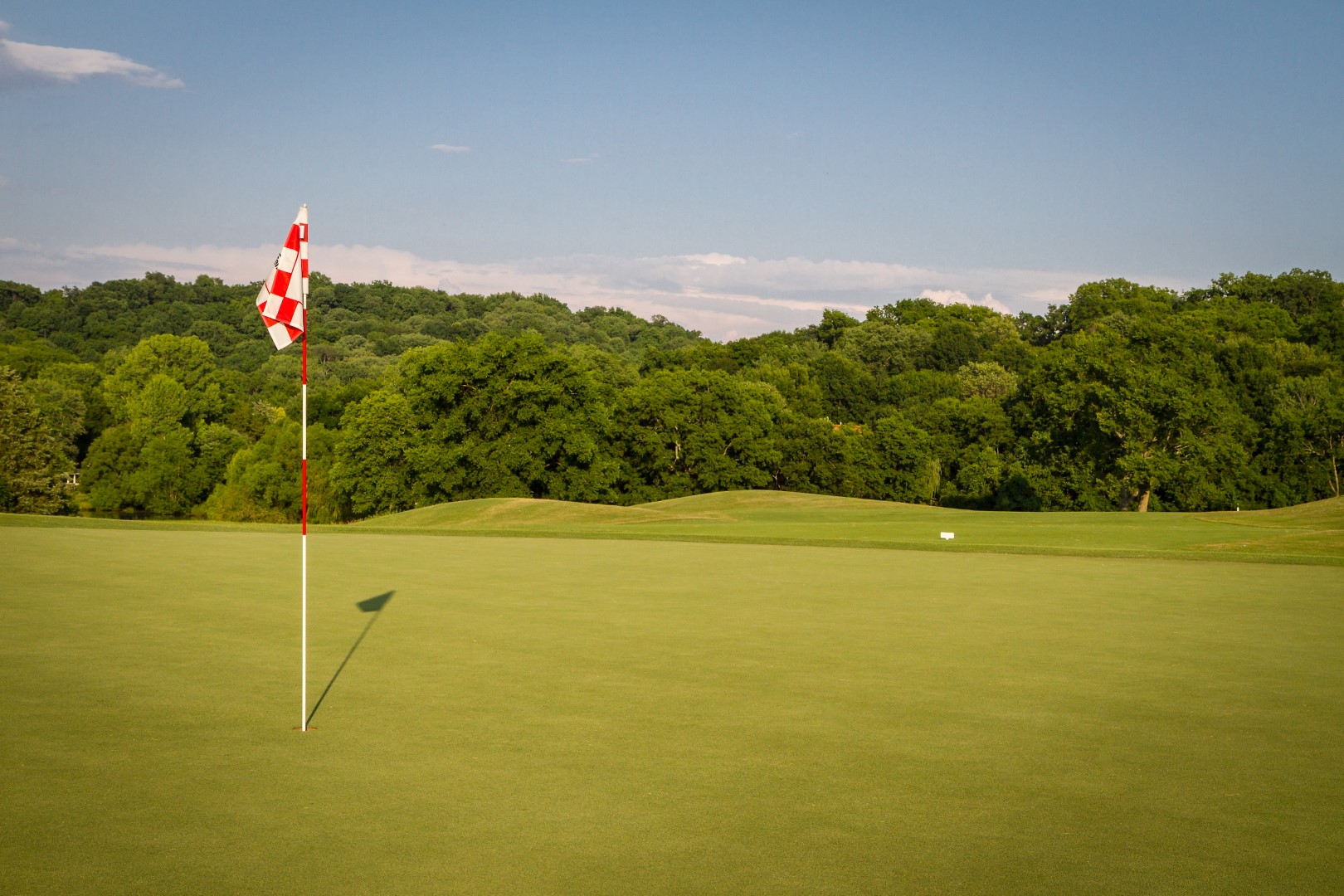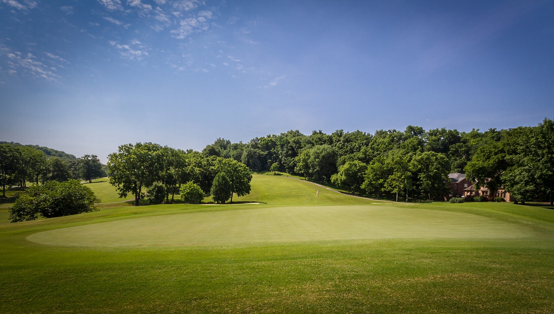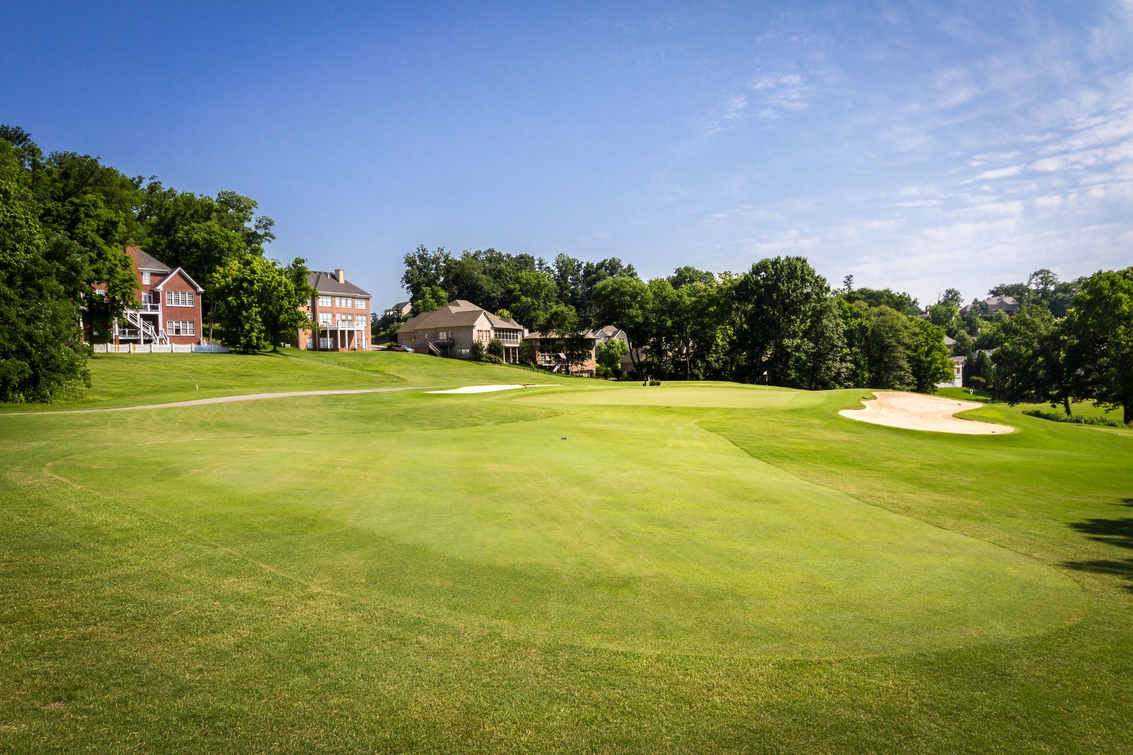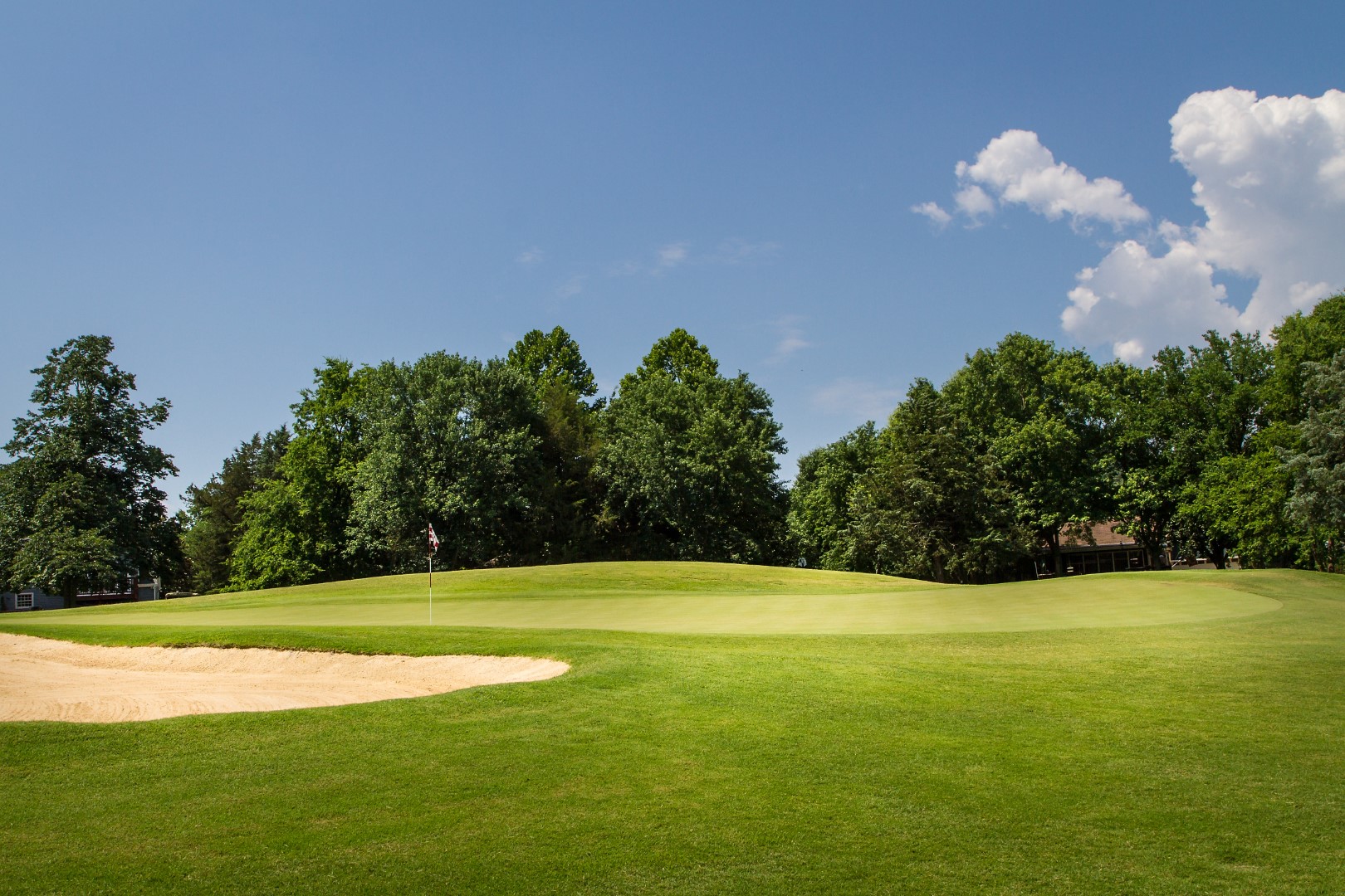 Dog leg left par 4 that plays a club uphill on the second shot. This green is the most severe sloping from left to right.