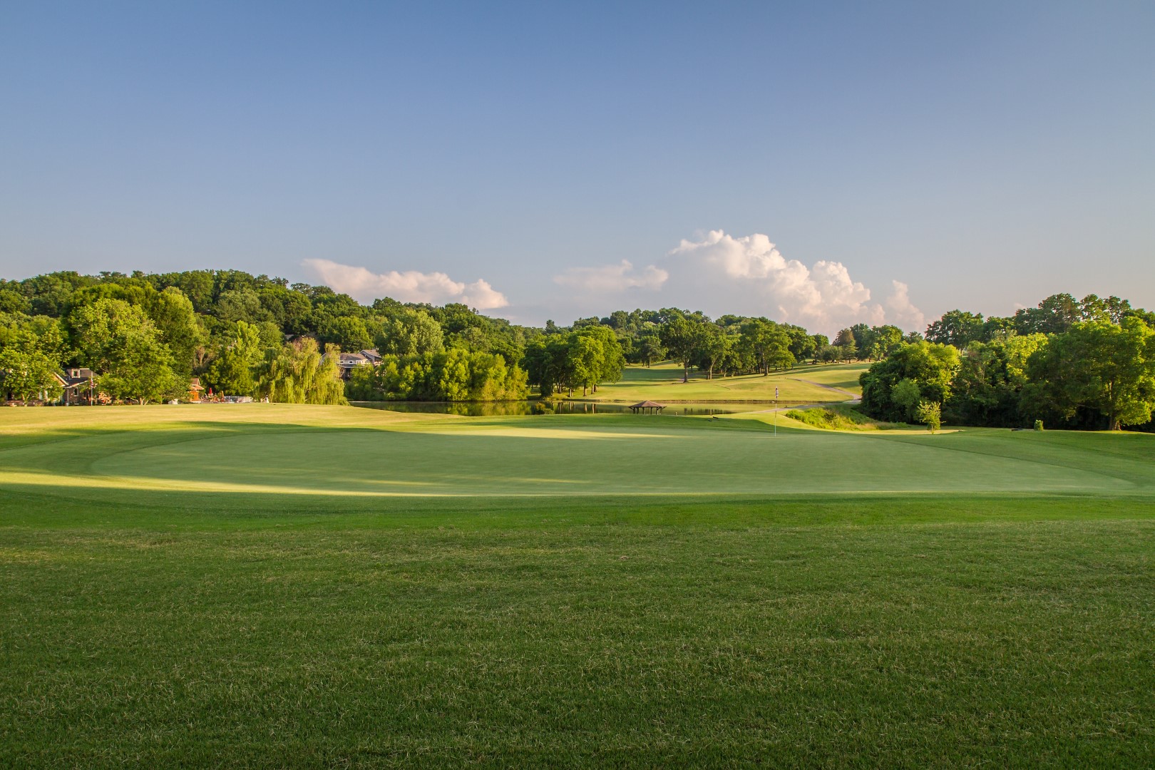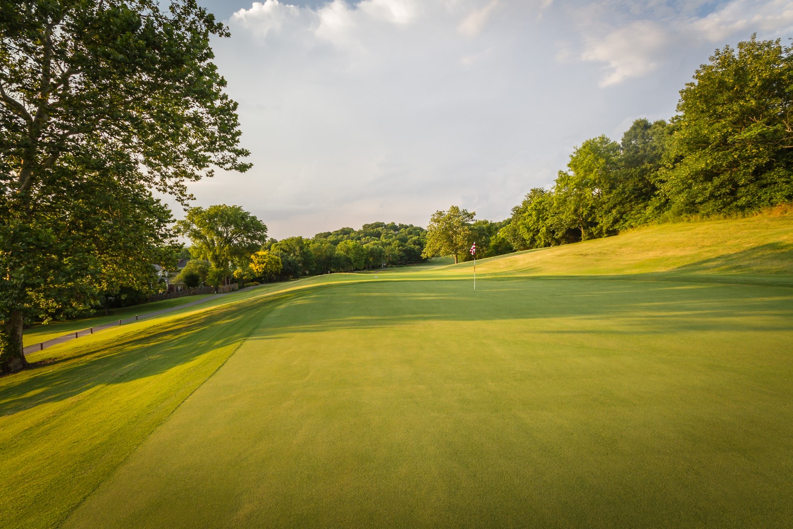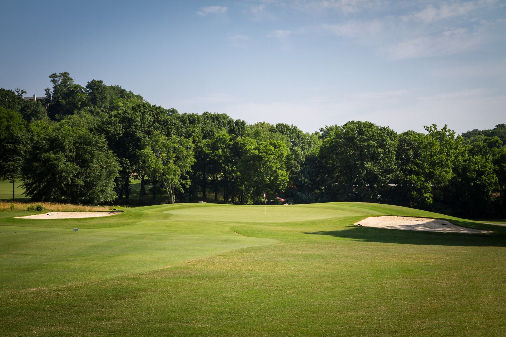 Dog leg left par 4 that plays a club uphill on the second shot. This green is the most severe sloping from left to right.
