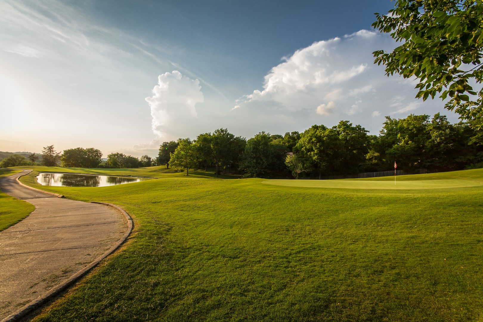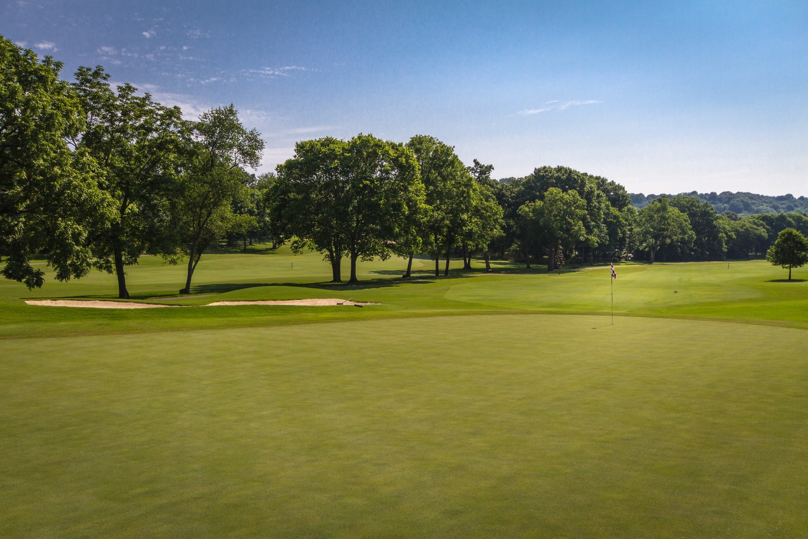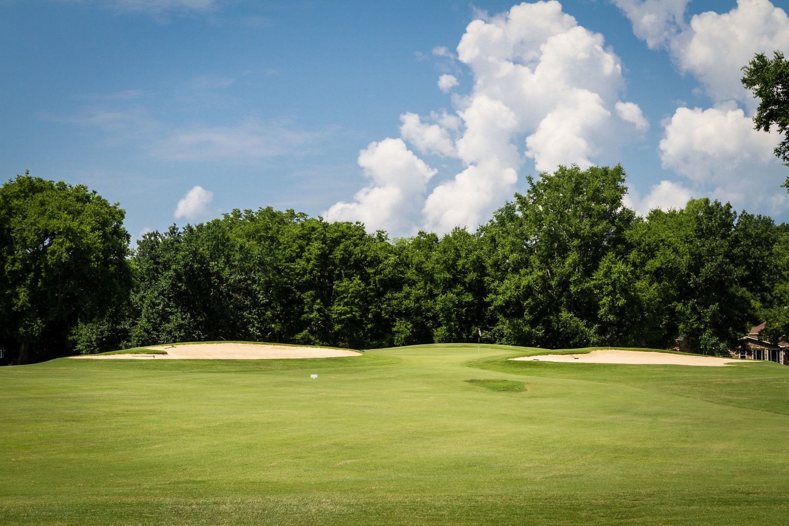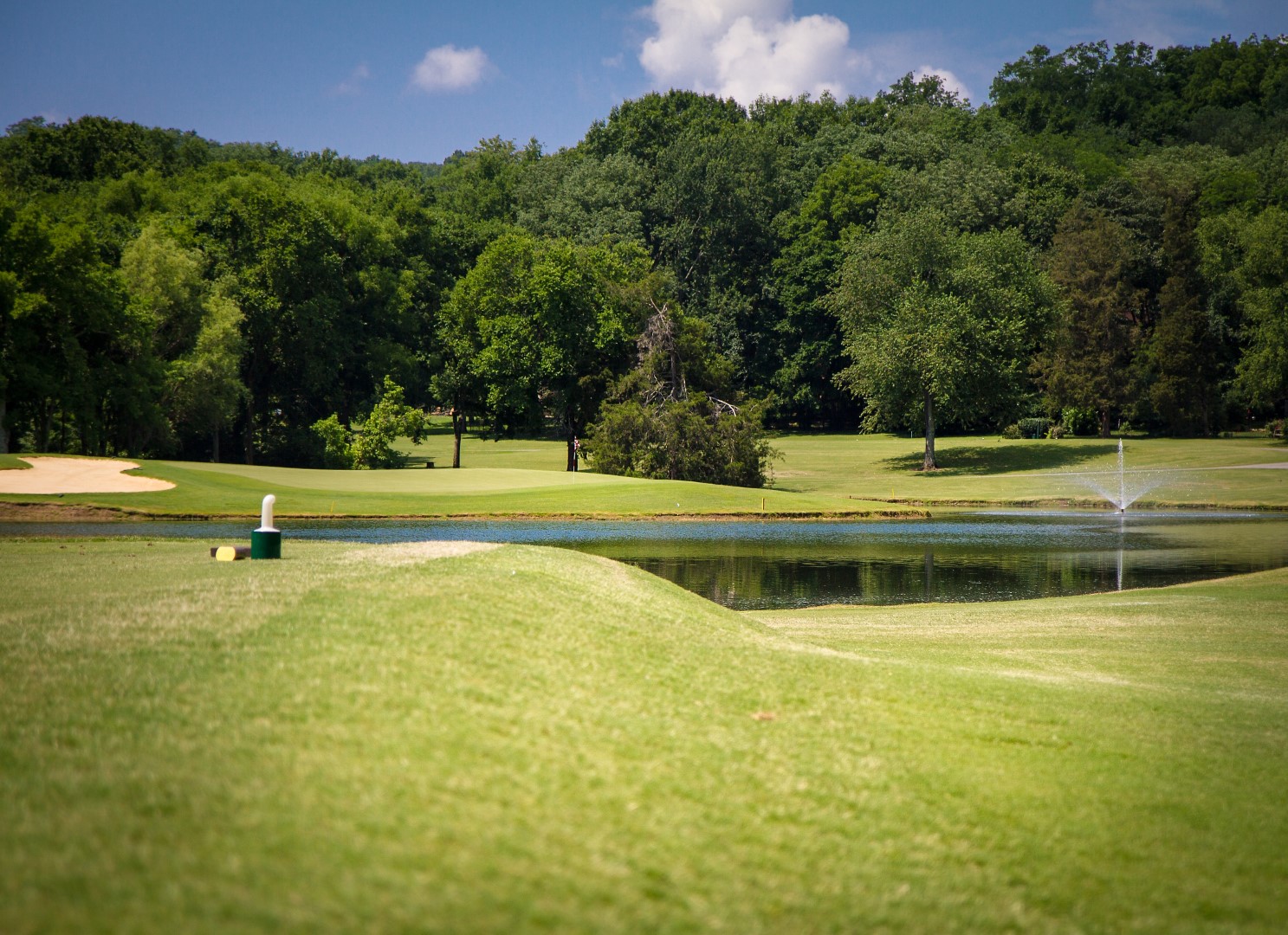 Dog leg left par 4 that plays a club uphill on the second shot. This green is the most severe sloping from left to right.