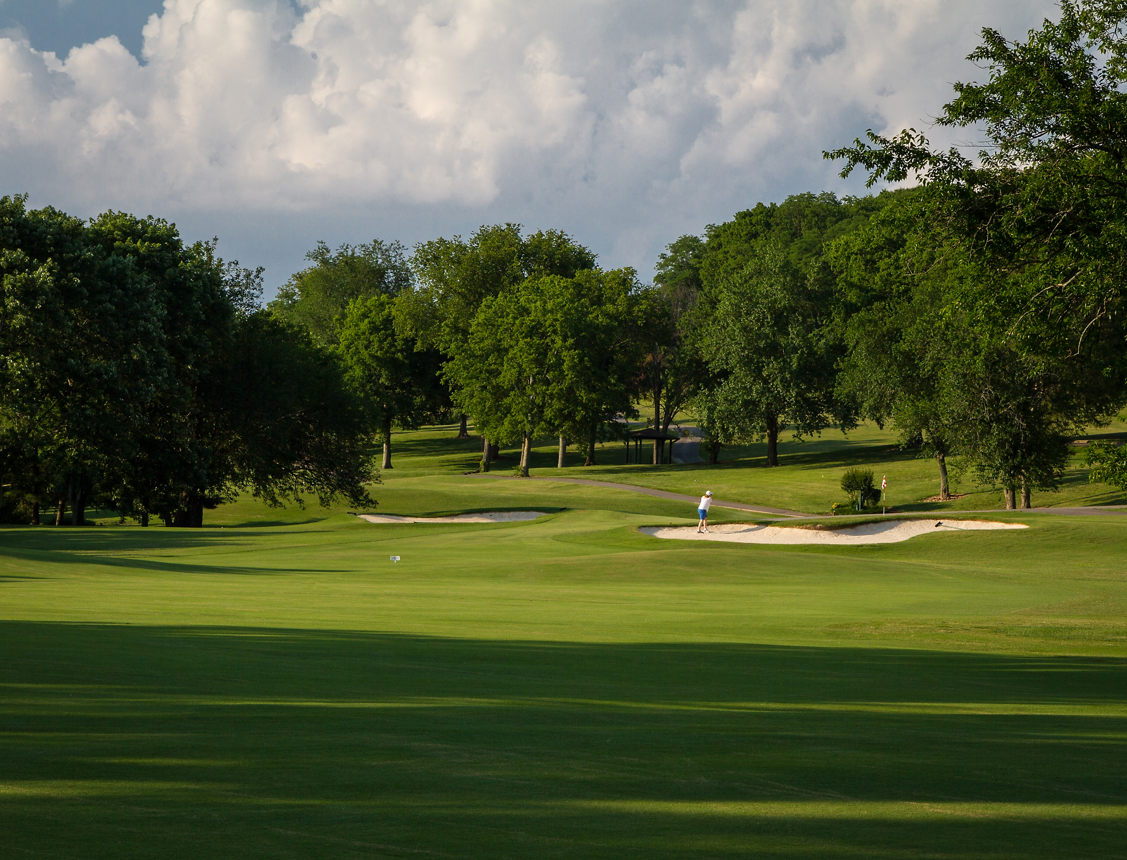 Keep your tee shot left center off the tee and the second shot plays a club longer depending how long you are off the tee.