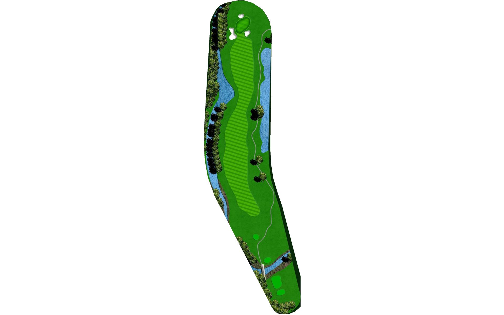 This is the only dogleg left Par 4 on the course. Keep your tee shot right and your second shot left. The greens right side is well protected by a deep creek.