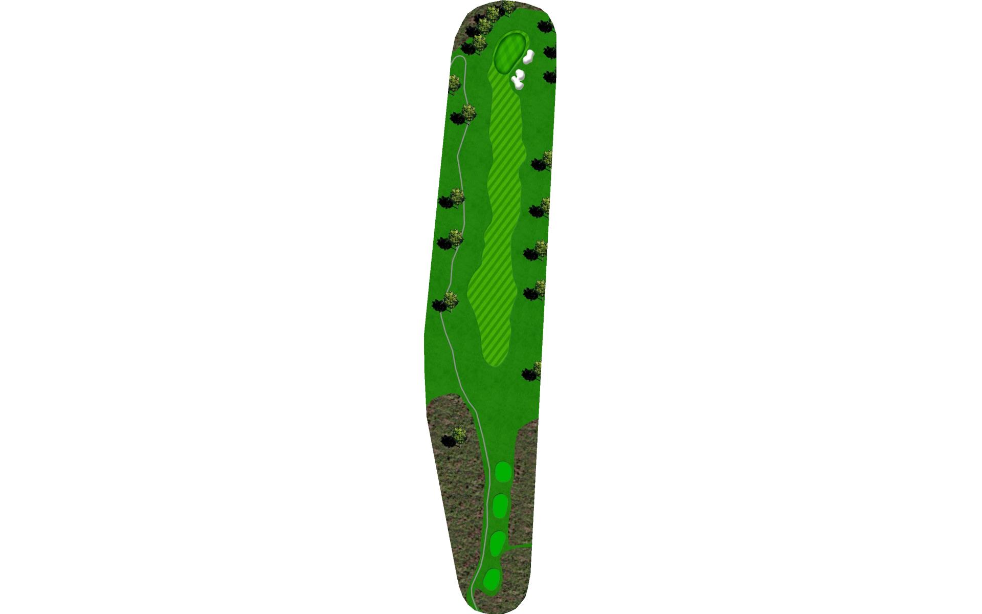 The green on this long, downhill par 3 is tucked into a hillside that slopes to the right. Trees shadow it’s left side. There is real trou…