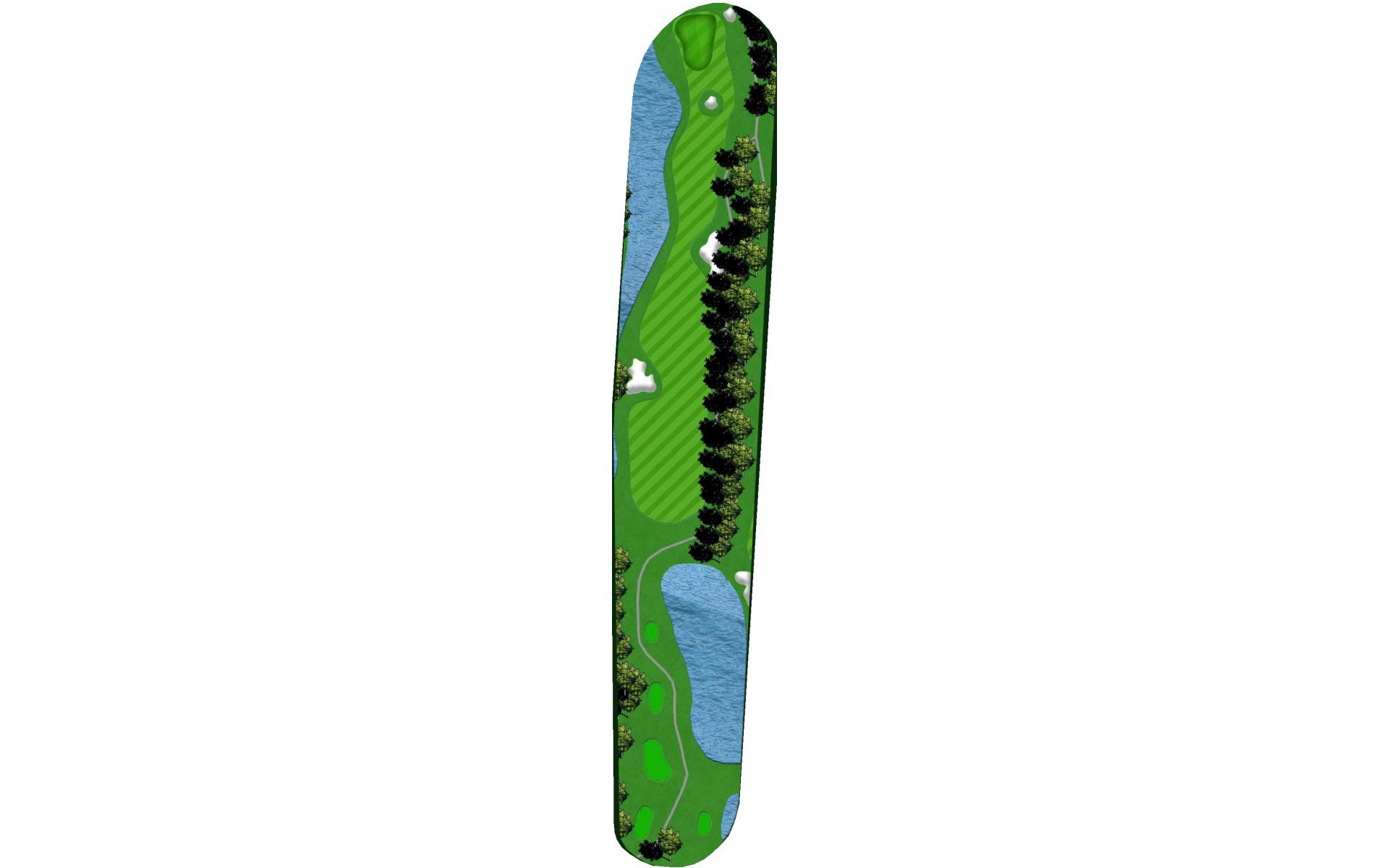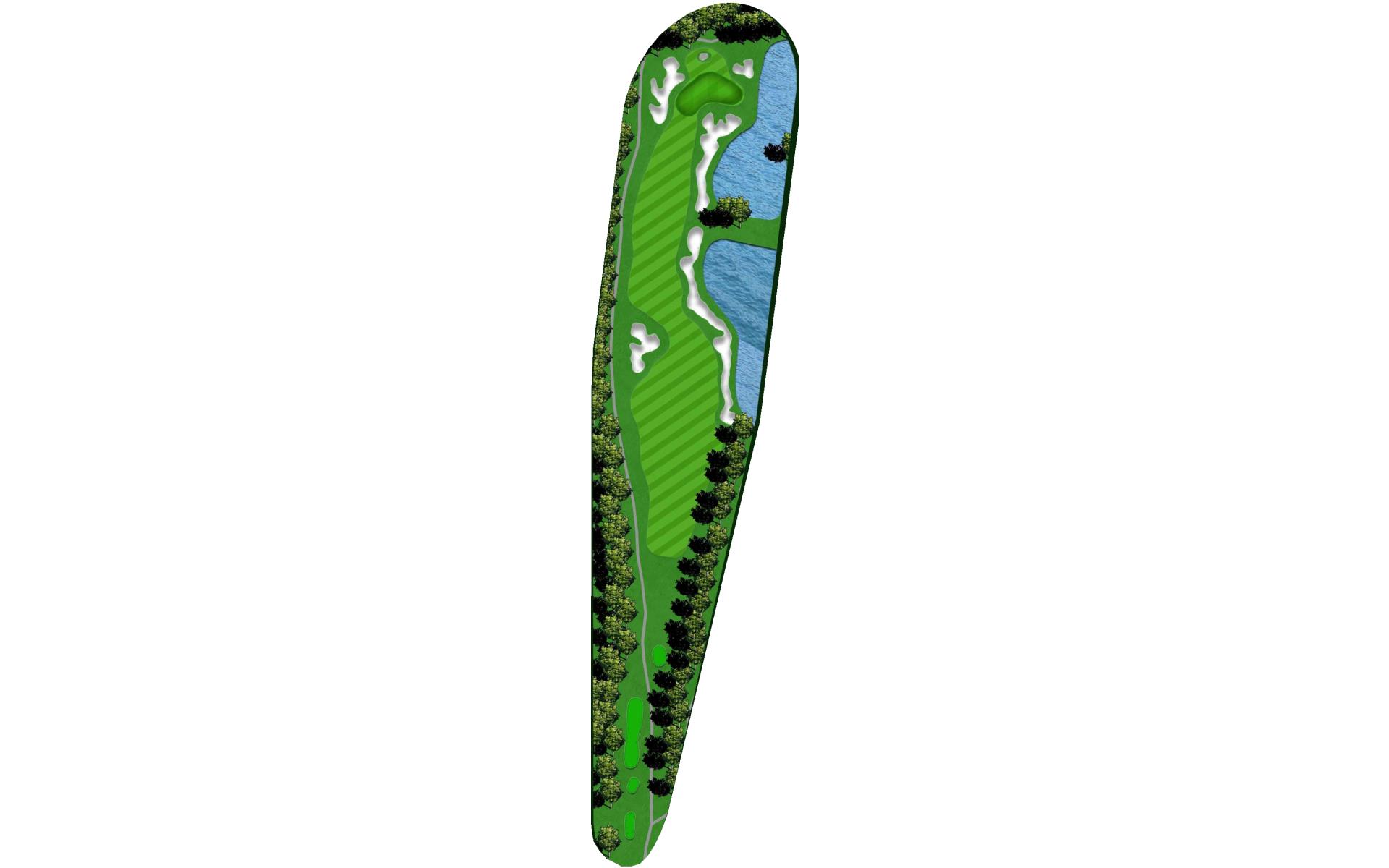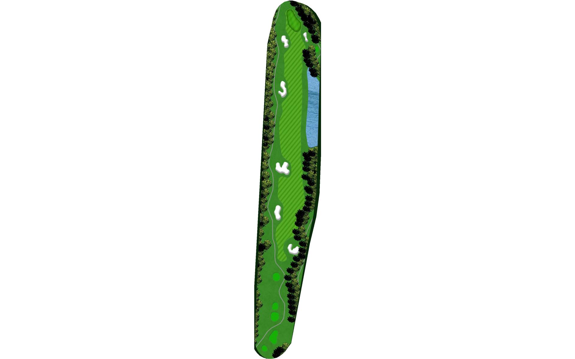 Hitting a good drive on this hole is more important than a long drive. Avoid the bunkers and water down the right hand side of this hole. Aim left center of the fairway, avoid the trouble on the right hand side of this hole and you set yourself up for a good chance at par.
