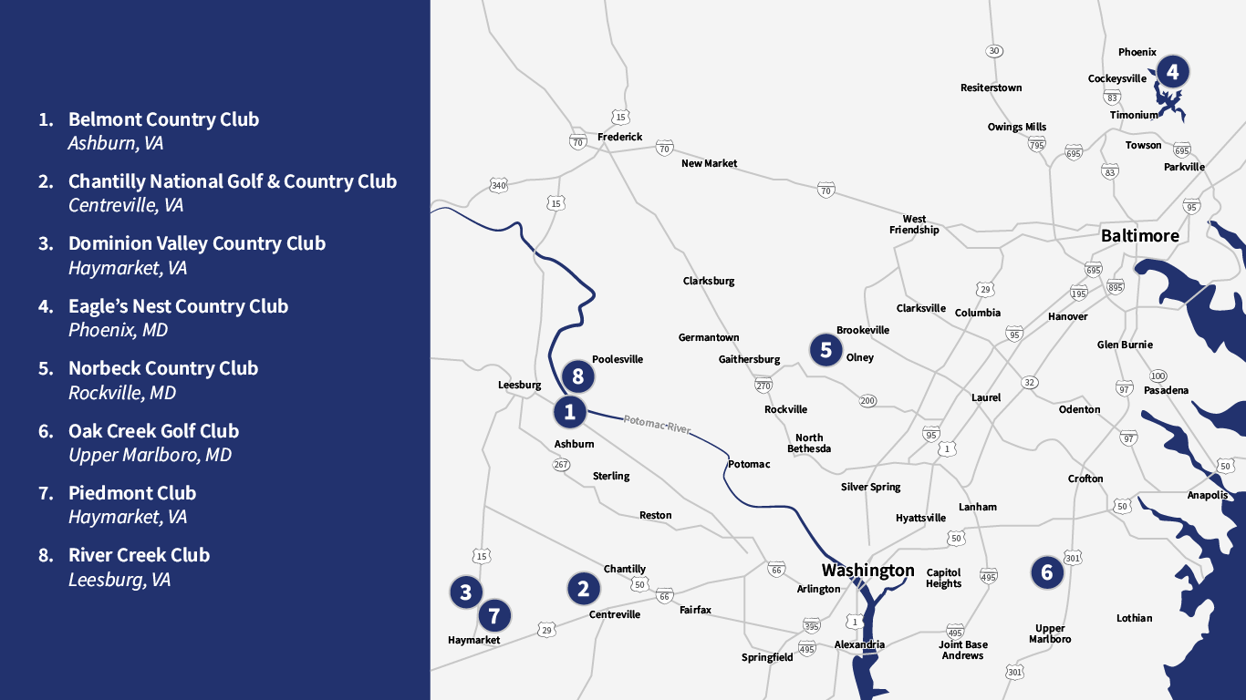 Explore our 8 D.C.-area country clubs to find the best club for you. Whether you're hosting a corporate event or looking for a premier venue for team-building, our clubs offer the ideal setting for your next event.