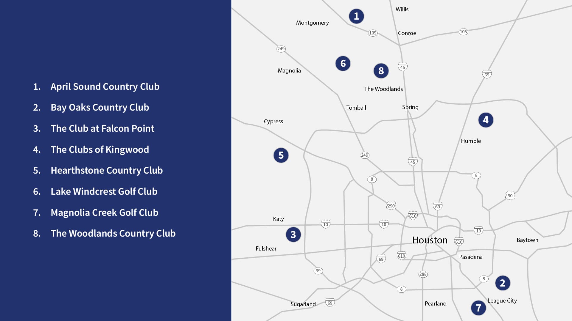 Explore our 9 Houston-area country clubs to find the best club for you. Whether you're hosting a corporate event or looking for a premier venue for team-building, our clubs offer the ideal setting for your next event.
